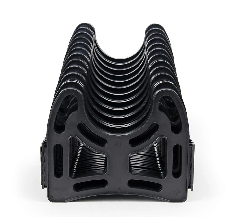 Camco RV 15 ft. Sidewinder Plastic Sewer Hose Support is sturdy and lightweight. Plastic support with strong snap-fit hinges has deep cradles to hold Sewer Hose in place without straps. No staples to rust. Easily positions around obstacles and stays where you put it. Won’t creep closed. Convenient handle makes storage even easier. The bottom of the Sidewinder cradle is 7-1/4 in. high at its highest point and 4 in. high at its lowest point. Patented.
