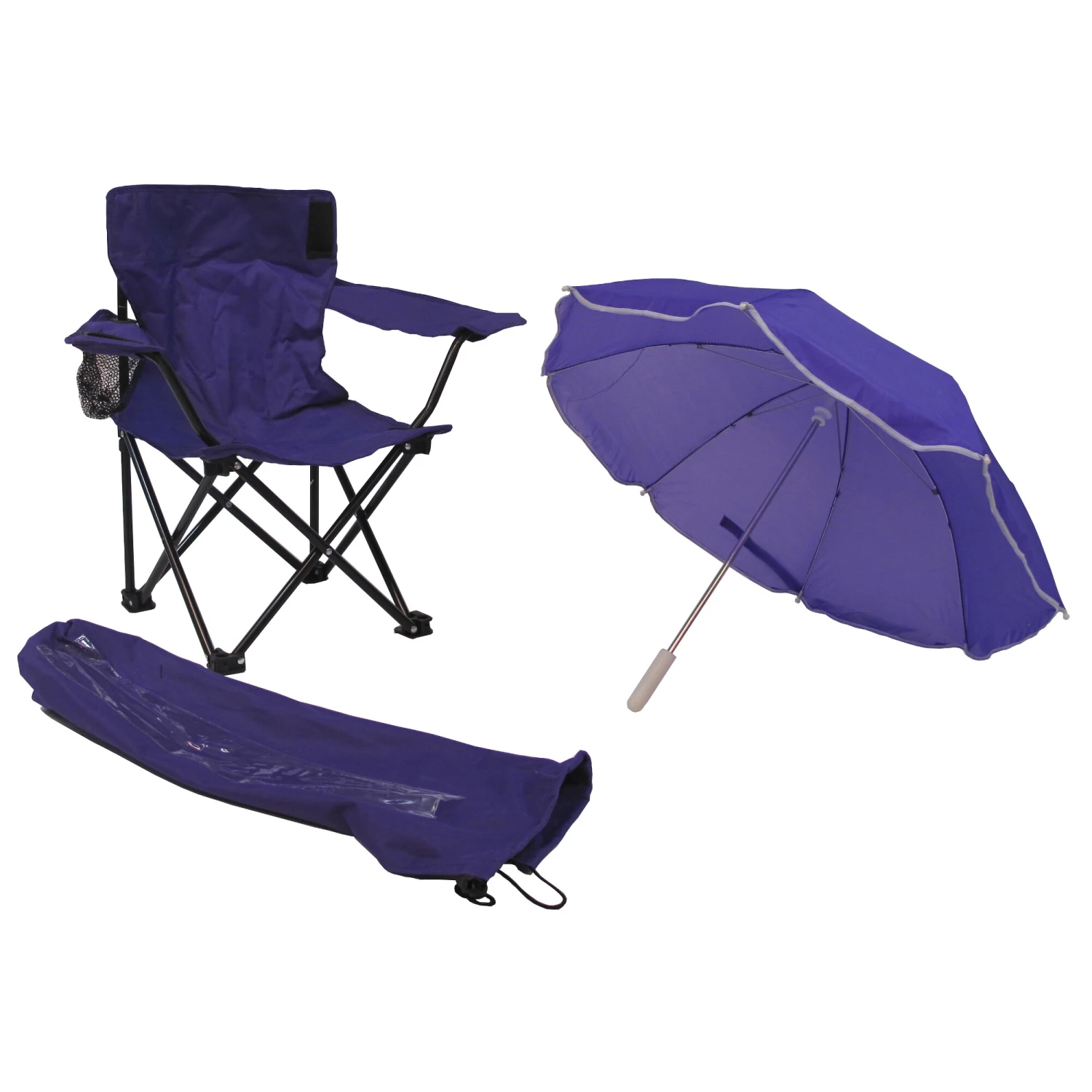 - Complete folding camp chair with removable shade umbrella and matching tote bag