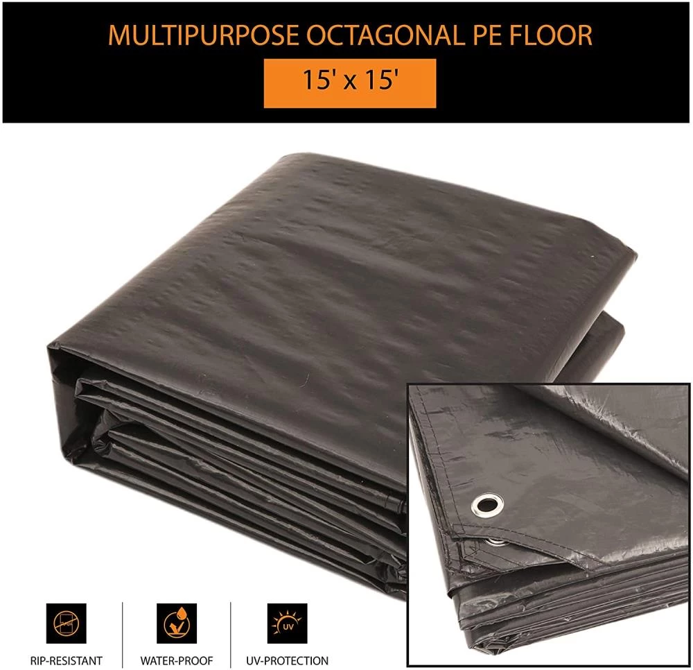 Alvantor PE floor lightweight mat measures 15x 15′, only 6.5 lbs. PE used as the floor or cover of, Alvantor breezy hexagonal 10 panel 15×15′ screen house and winter gazebo.it Can protect you from dirty ground and insects.the Trap made of weave polyethylene thread with 10 mil thickness.dual Lamination for water resistance, washable. Aluminum high strength rust-resistant grommets reinforce each corners and middle,allow this poly tarp to be tied down and secured simply.taking it as a floor mat when you go hiking, camping or on the beach, providing shelter from the elements,like wind, rain or sunlight for campers. You can hang it on to protect your flowers, plants, flower stands and animals from burning sun or heavy rain. It also can be used as a cover to collect the fallen leaves, keep your pool, playground and backyard clean. Moreover it can be used as protection for boats, cars or motor vehicles, or as a temporary pickup truck bed cover.