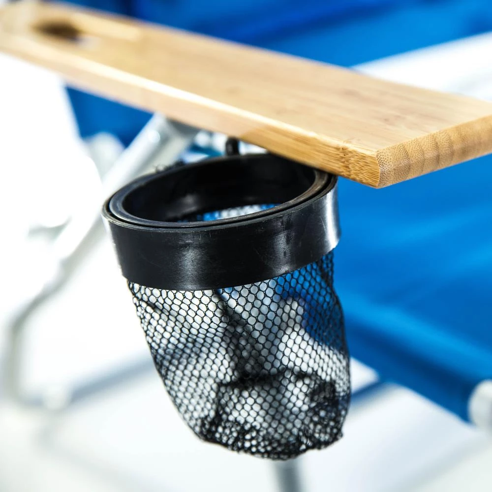 - Extra wide wooden armrest with carry strap and cup holder