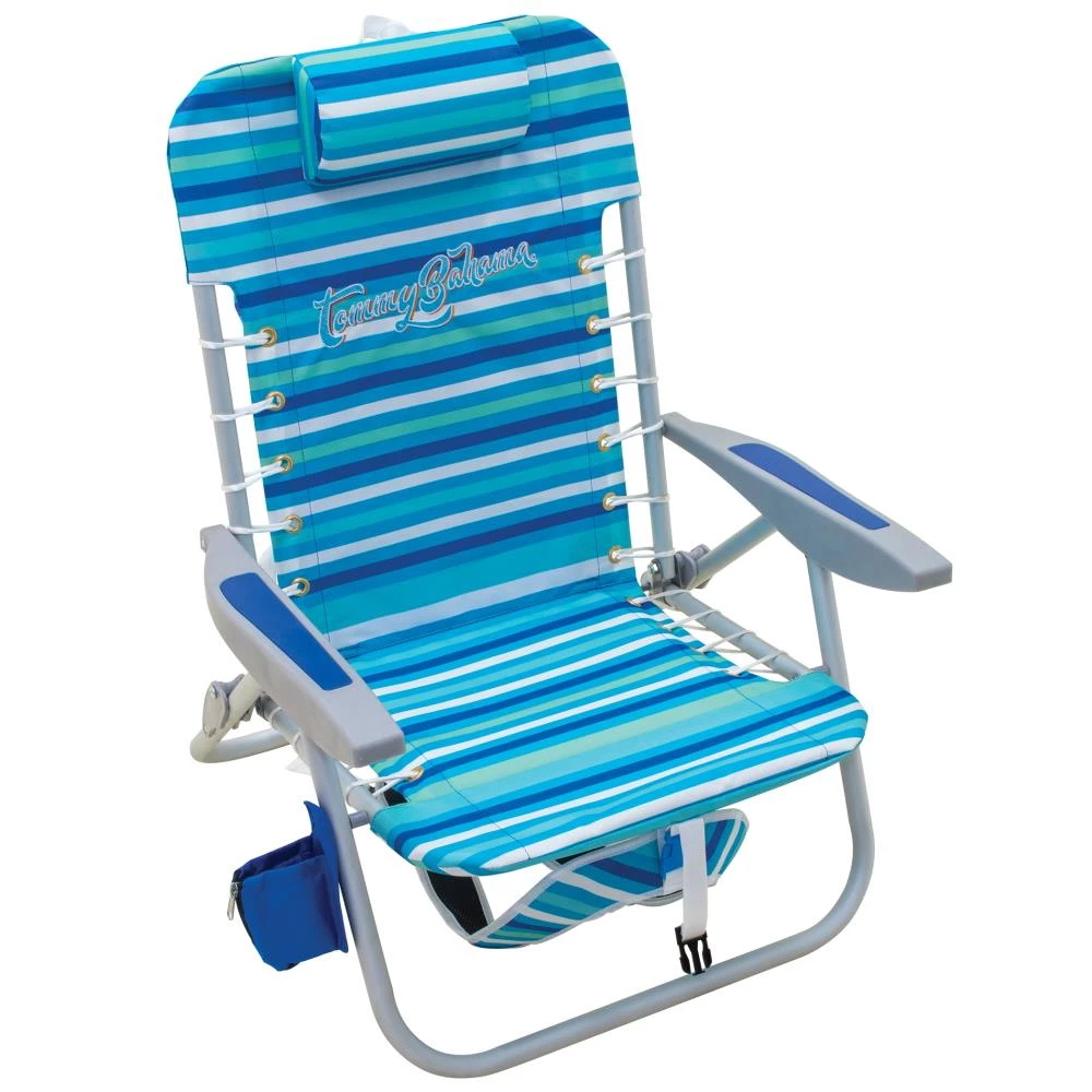 Bring what you need with the portable, multi-purpose Tommy Bahama backpack chair. Perfect for your next beach trip, camping adventure, or backyard barbeque, this chair features a built in drink holder and pouch for your cell phone or keys. The lightweight frame carries easily with padded backpack shoulder straps, while the adjustable contoured pillow provides added comfort for a relaxing day.