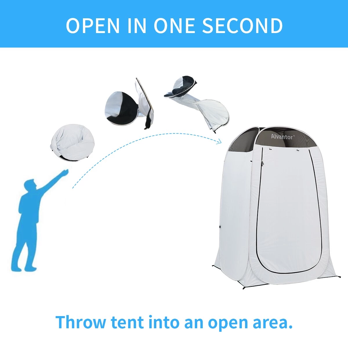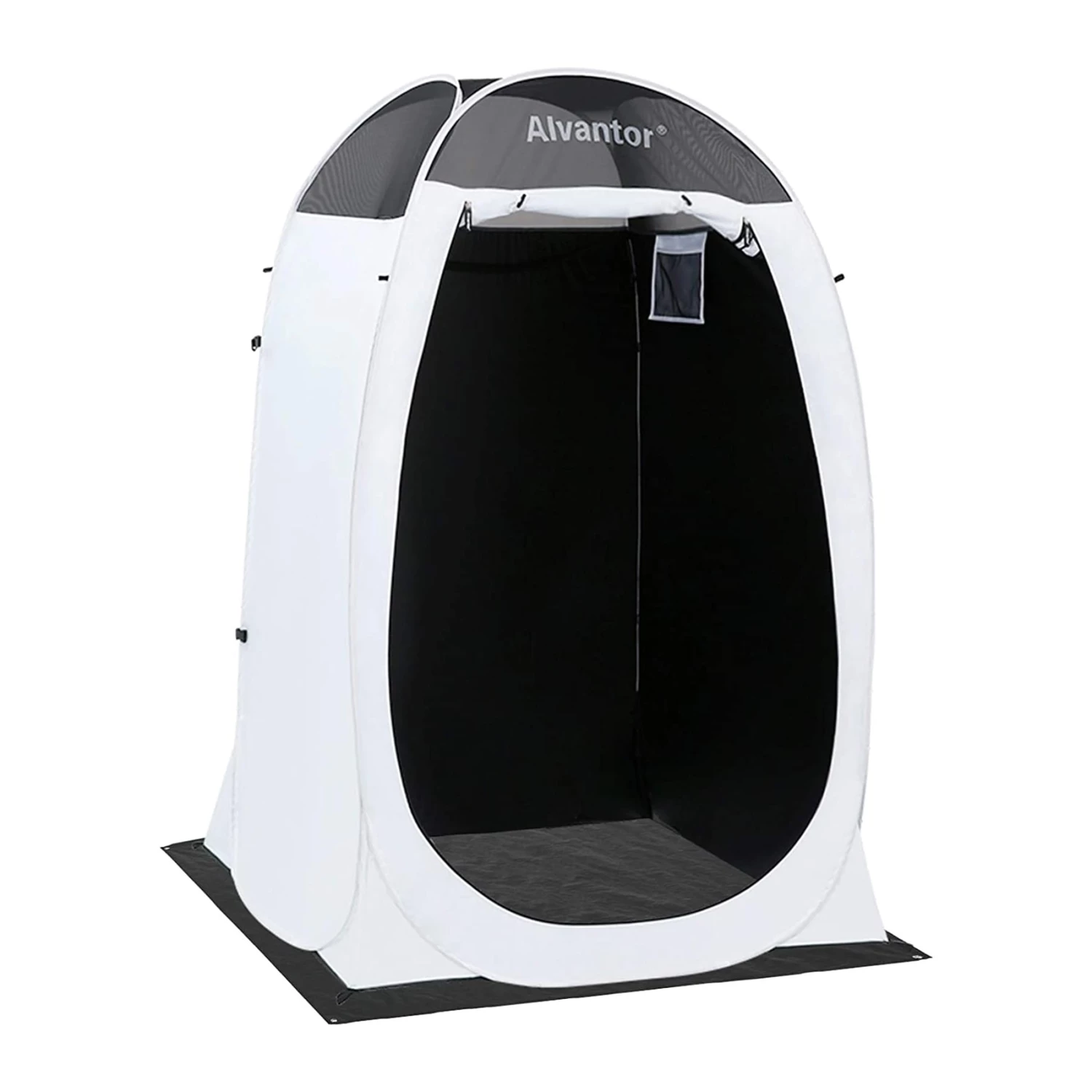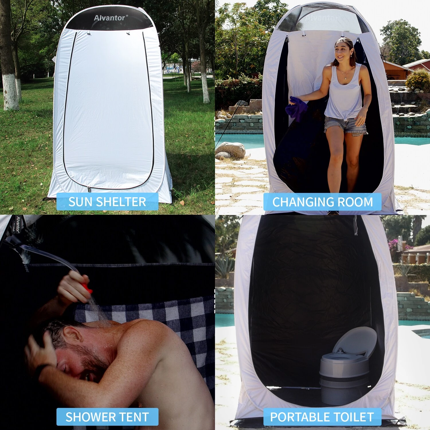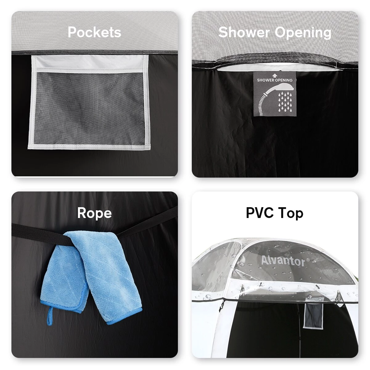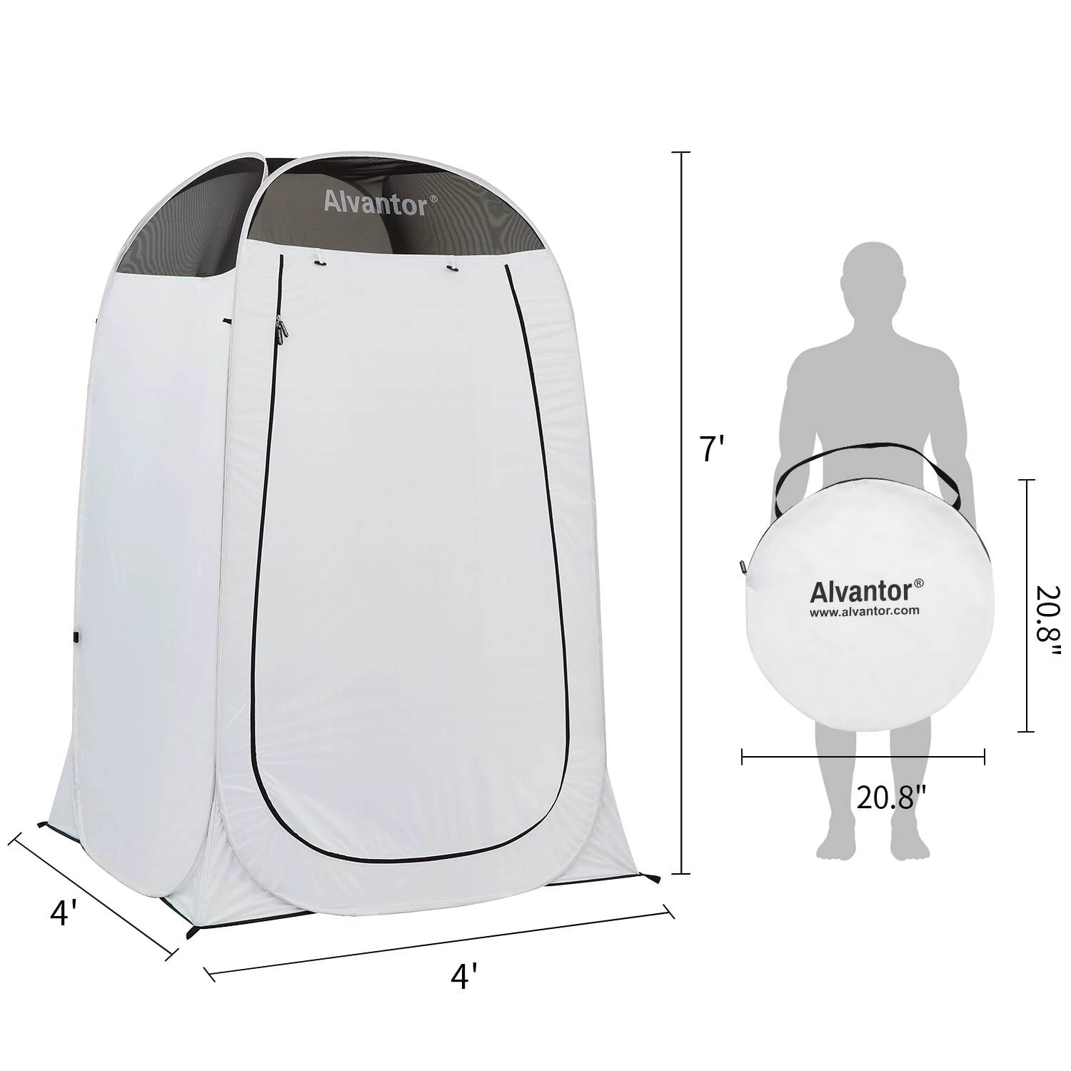 Enjoy the private space by using Alvantor pop up shower tent canopy. This shower room is designed in pop up style and provide the UV 50+ protection. The 300D poly-oxford fabric with Teflon coating! There are pockets inside for phones, the rope for hanging towels or clothes. This privacy shelter can use for changing clothes, taking a shower, privacy toilet and privacy restroom on the beach, camp, photo studio and more!
