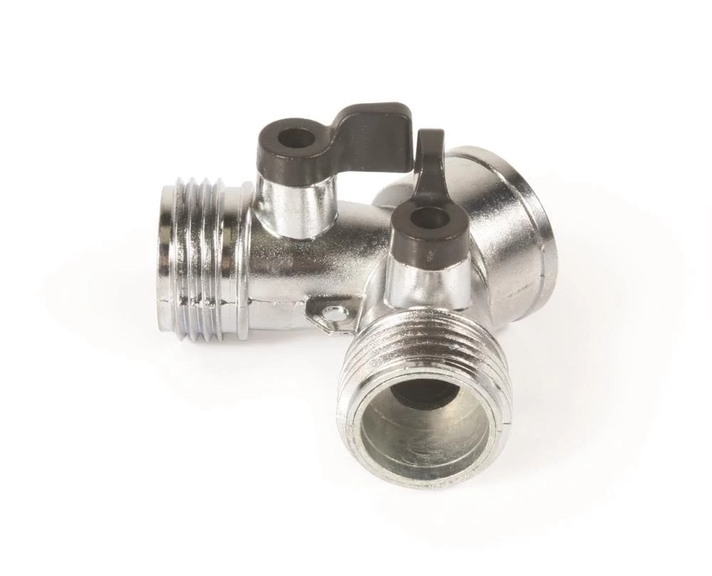 Y-style shut off valve converts a single-line hose to two directions. Each side is valve controlled to easily adjust flow and pressure. Heavy duty metal.